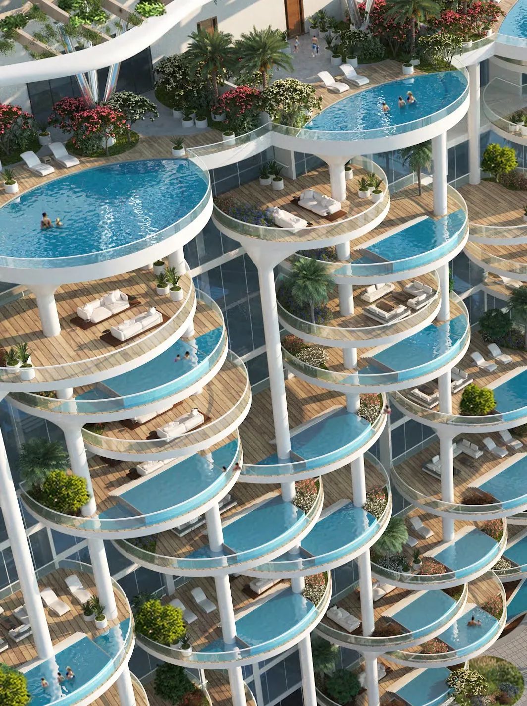 當(dāng)?shù)谒拇≌袑偾把靥剿鲿r(shí),它已不囿于將綠意懸于高空,更將壯闊的泳池凌空托起——打造出名副其實(shí)的“空中莊園”。 若將空中花園視為四代住宅,此般創(chuàng)舉被冠以“五代住宅”之稱,實(shí)至名歸。
