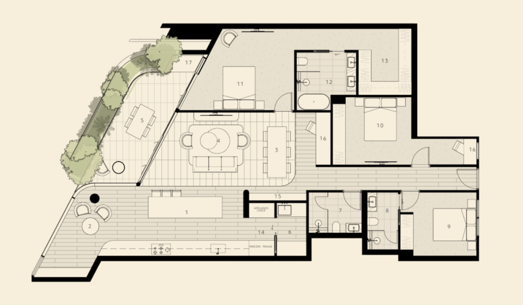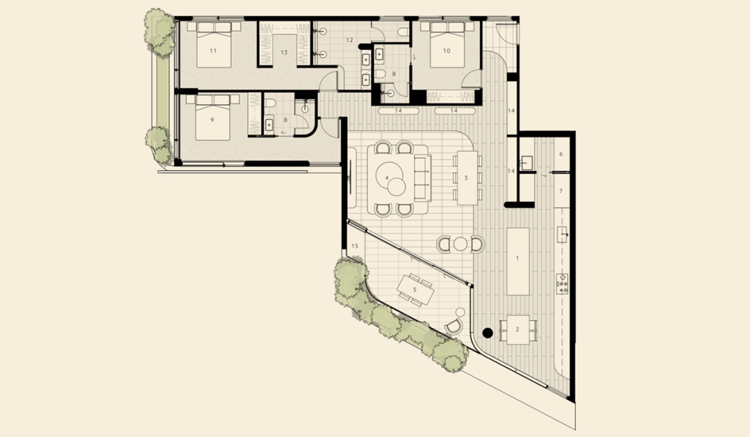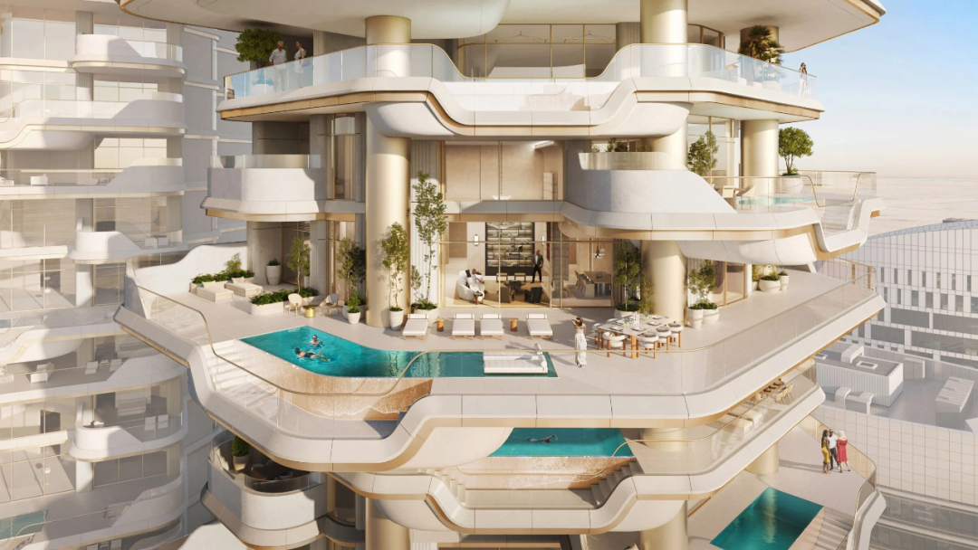 3-5居室,面積約650㎡-975㎡,均為全平層設(shè)計(jì),配備私人電梯大堂。室內(nèi)空間層高優(yōu)越,融合大理石、金屬與定制木飾面,營(yíng)造奢華現(xiàn)代感。開放式客廳配大面積落地窗,盡享景觀。每套住宅在陽(yáng)臺(tái)均設(shè)私人泳池和寬敞的戶外生活空間,打造度假式生活體驗(yàn)。