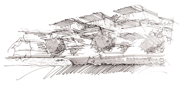 首層入口采用大面積石材,展現(xiàn)沉穩(wěn)而精致的建筑質(zhì)感。植被沿著建筑輪廓層層鋪展,與石材立面形成鮮明對(duì)比,柔化建筑的硬朗線條,使整個(gè)空間更具生機(jī)與層次感。