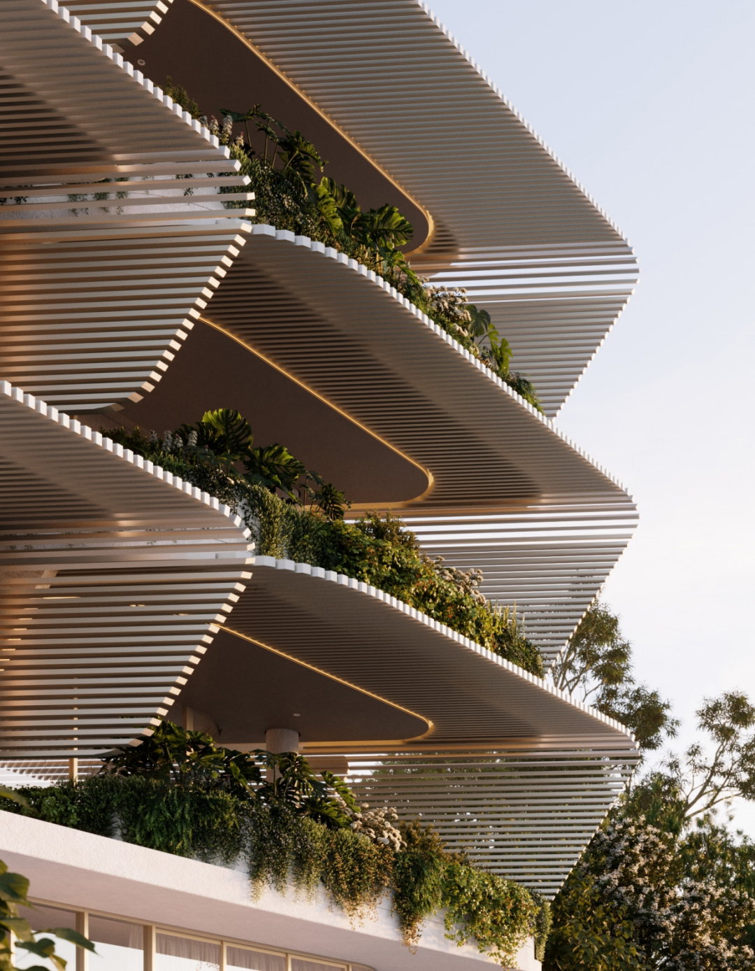 建筑形態(tài)通過(guò)流暢體量變化,形成輕盈靈動(dòng)的輪廓。陽(yáng)臺(tái)結(jié)合立面木條構(gòu)成深邃懸挑式結(jié)構(gòu),既遮陽(yáng)又增強(qiáng)層次感。這些寬闊露臺(tái)提供私密休憩空間,同時(shí)賦予建筑獨(dú)特韻律。