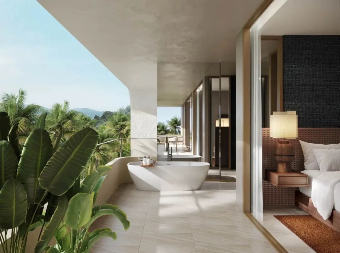 ? 單元標(biāo)配大面積戶外陽(yáng)臺(tái),整合休憩區(qū)、日光浴平臺(tái)及半戶外浴缸區(qū),與室內(nèi)浴室形成流動(dòng)空間。