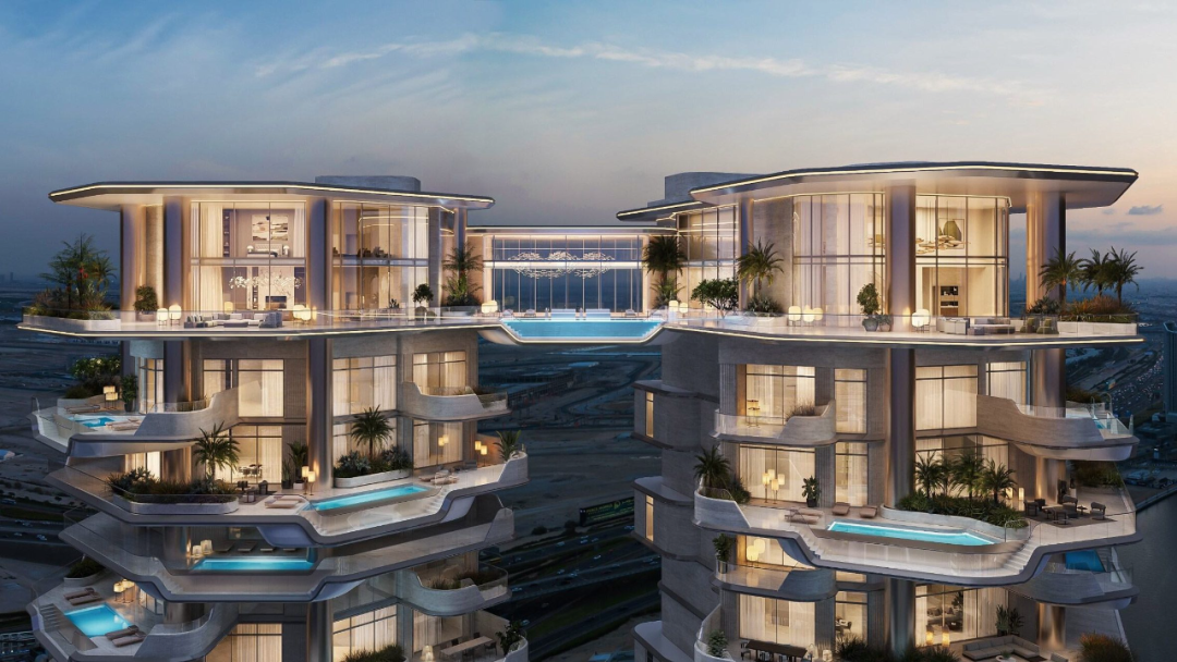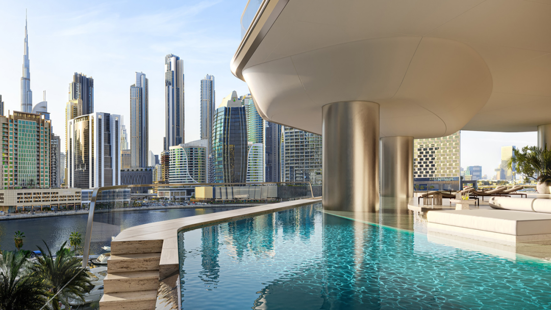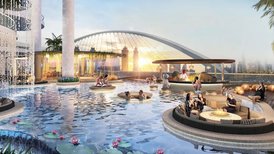 迪拜麗晶公寓(Regent Residences Dubai)由福斯特建筑事務(wù)所設(shè)計(jì),設(shè)計(jì)亮點(diǎn)在于橫跨雙塔頂層的連接泳池,成為項(xiàng)目的核心視覺與體驗(yàn)焦點(diǎn)。