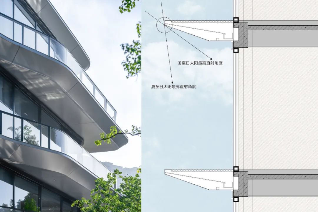 通過控制飄板的形狀大小可以更加合理的運用自然光,避免陽光直射,并通過在上表面做約5%的坡度幫助排水,增加鋁板的自潔性。