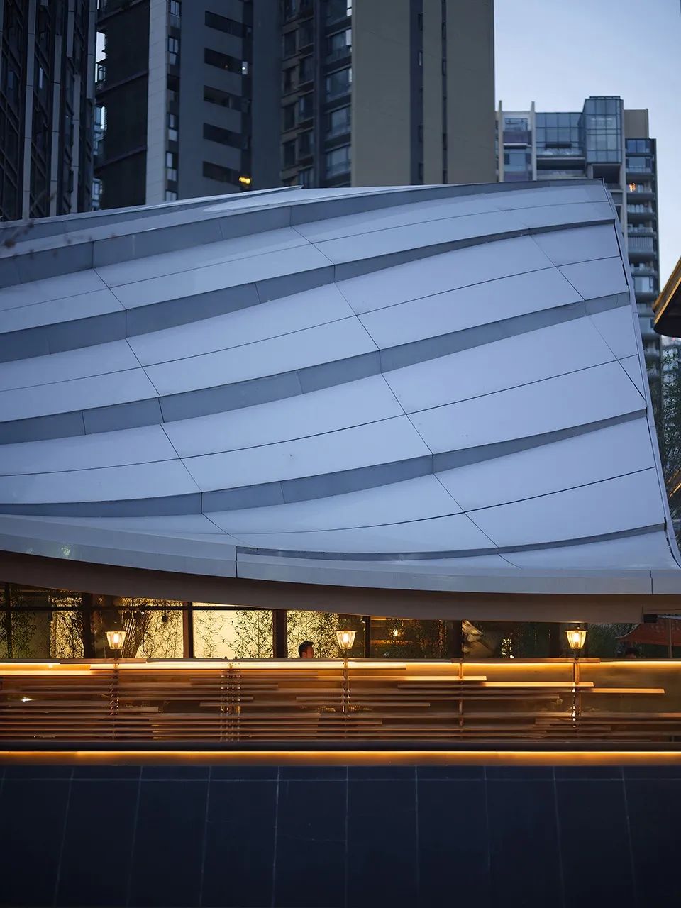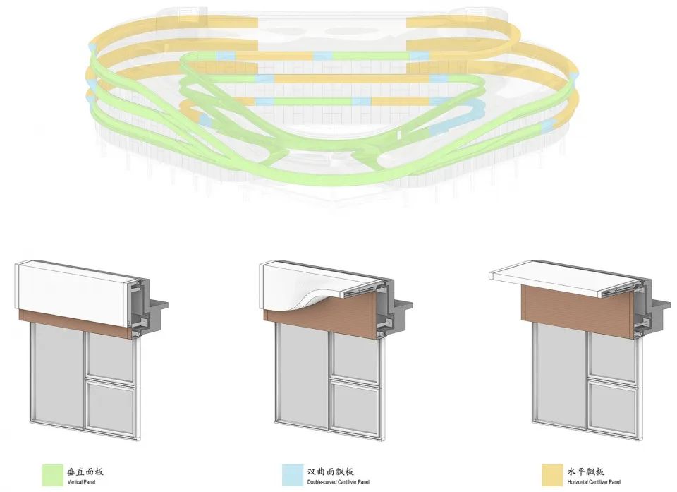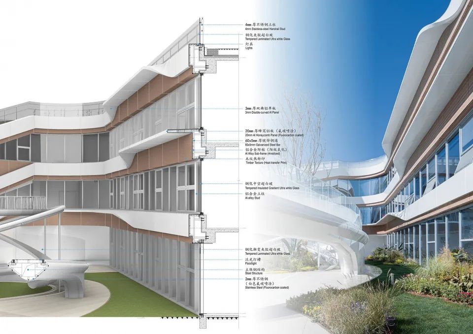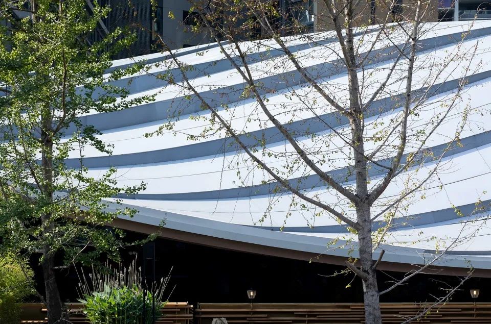 雙曲鋁板在深化過程中做了充分的優(yōu)化,以此實現(xiàn)了模塊化的加工和建筑表現(xiàn)力之間的平衡。而扶手采用的霧化玻璃為連續(xù)的屋面勾勒出兼顧安全與詩意的邊界。