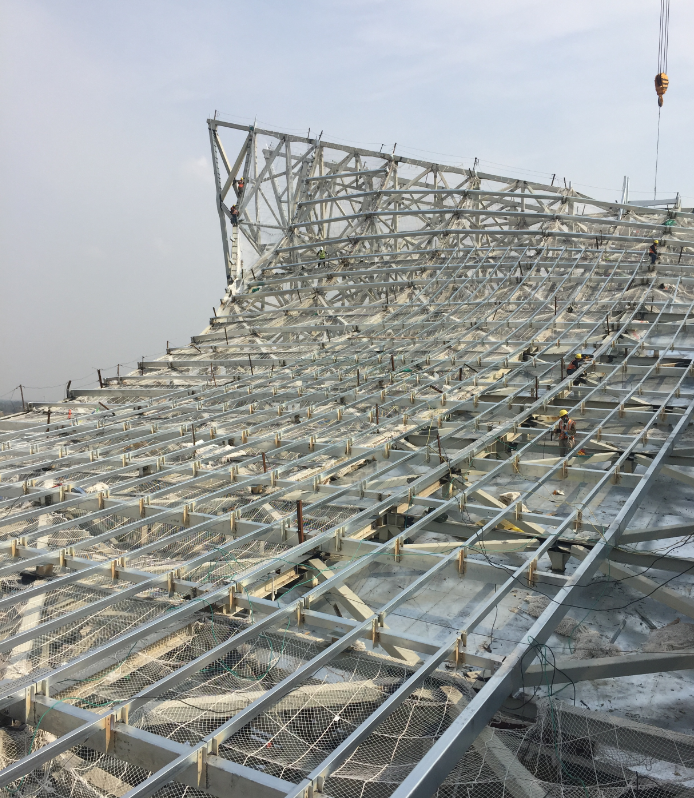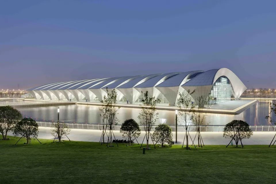 上海東方體育中心建筑采用大跨度鋼結構拱架和大尺寸雙曲面鋁板飾面。三角形桁架的所有曲面均沿下部結構框架形成同樣的半徑,塑造乘風破浪、揚帆起航的建筑形象。