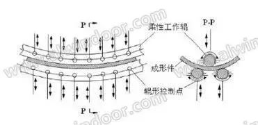 其特點是工作輥軸線可以彎曲,而且彎曲的形狀可以根據(jù)需要進行控制和調整,待成形件夾持于工作輥之間,工作輥在驅動機構作用下同步轉動,帶動工件產(chǎn)生進給運動,使工作輥滾壓板料,從而使板料產(chǎn)生縱向與橫向塑性變形,可適用于多種復雜曲面造型的鋁板成形,但設備價格昂貴,設備維護、調教成本也高。