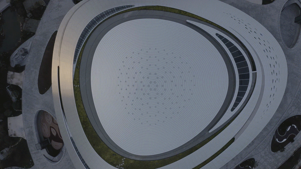 動感流暢的銀色建筑猶如時空穿梭中的“星際戰(zhàn)艦”,連接幻想與現(xiàn)實,融合建筑與環(huán)境。