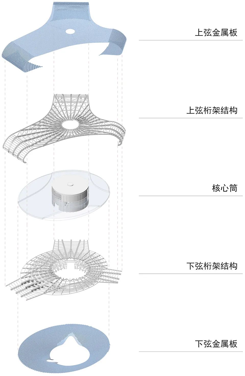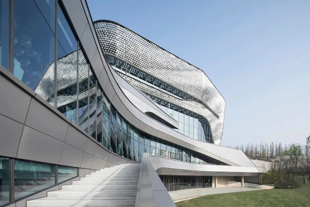 魚鱗片狀的鋁板運用BIM技術(shù),一萬三千多片不同規(guī)格的鋁板在外立面做各種轉(zhuǎn)變貼合,實現(xiàn)了富有韻律變化的雙向螺旋而上的肌理感。
