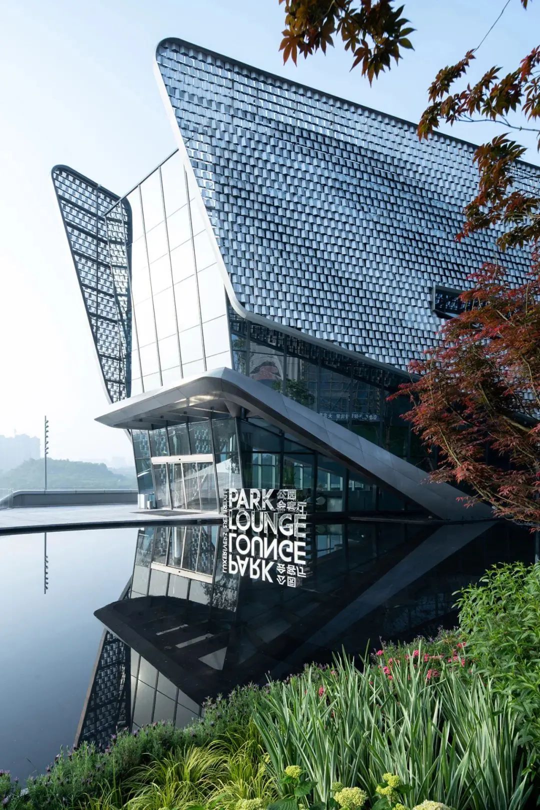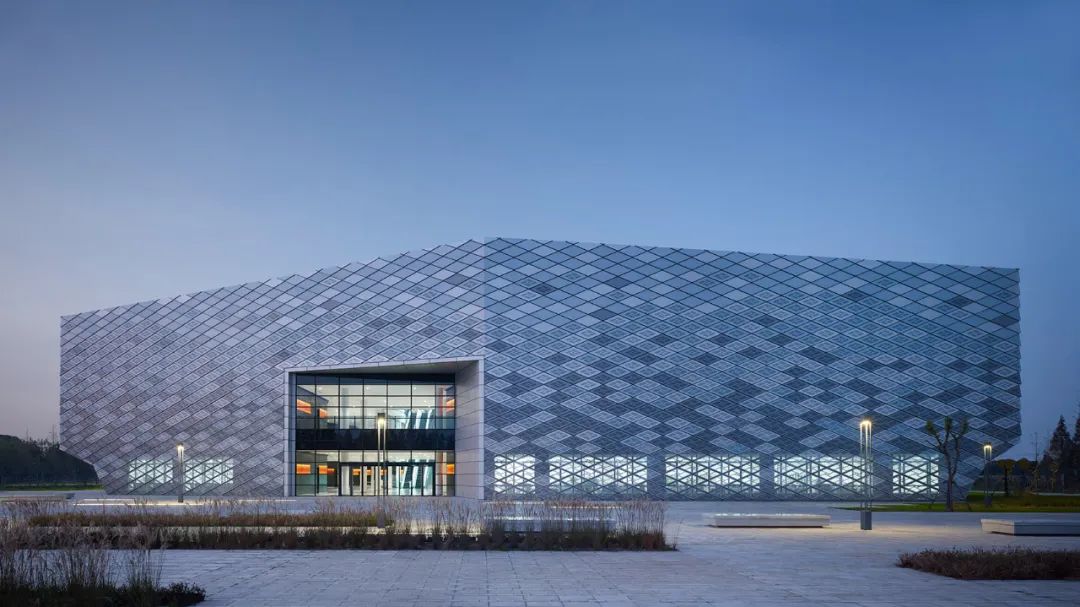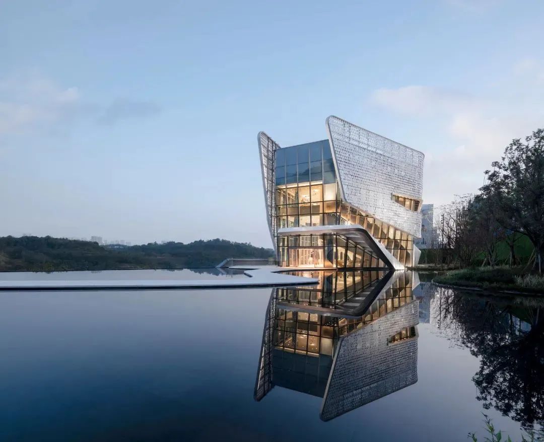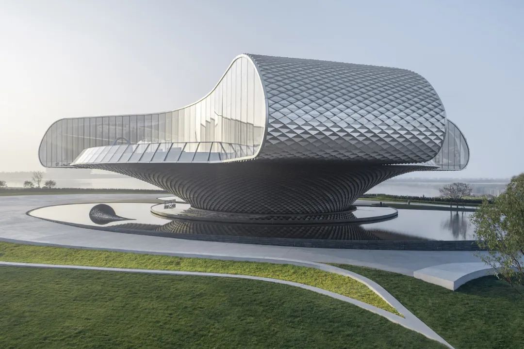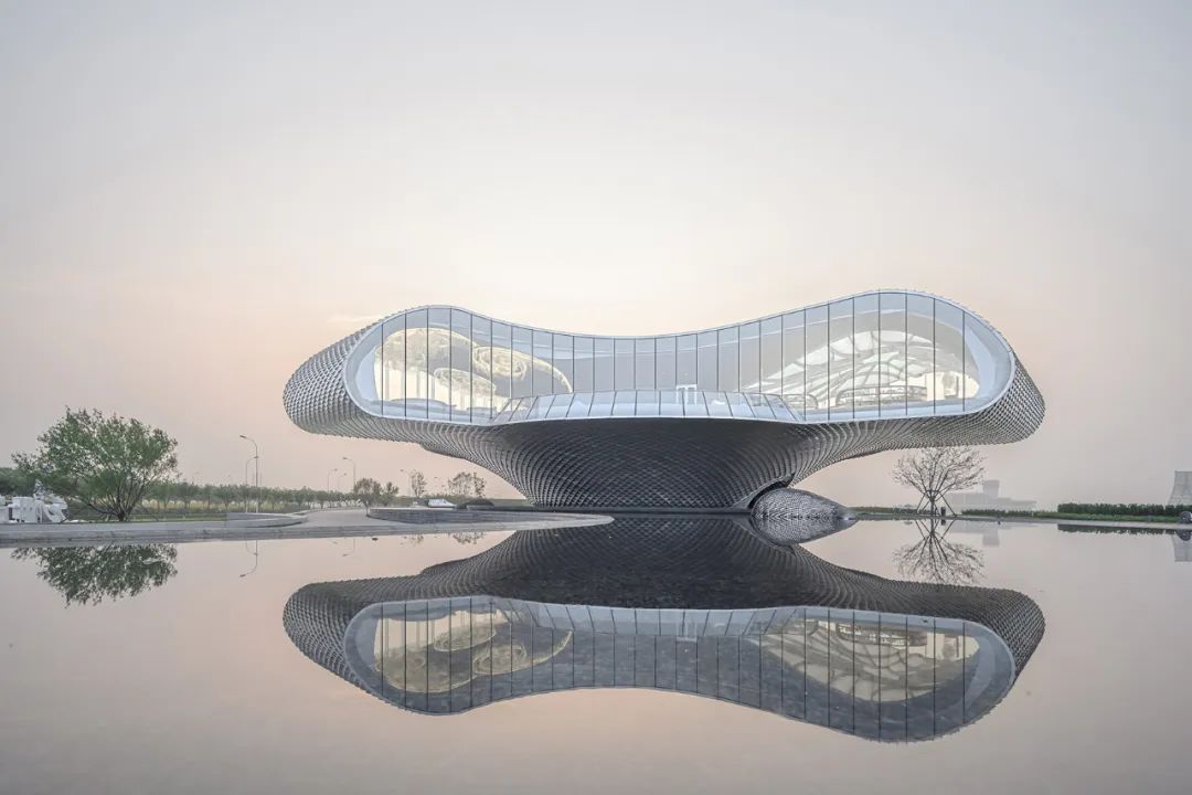 建筑的表皮運用一體化參數(shù)化設(shè)計,魚鱗片狀的鋁板微妙的變化排布,使外立面從各個角度反射不同時刻的陽光,建筑周圍的水池對光線的漫反射,再次投射到鱗片狀的立面上,使建筑呈現(xiàn)出豐富的光影變化。