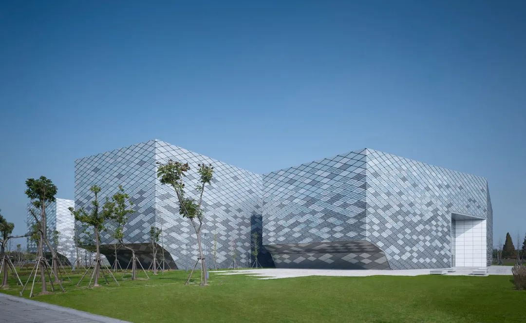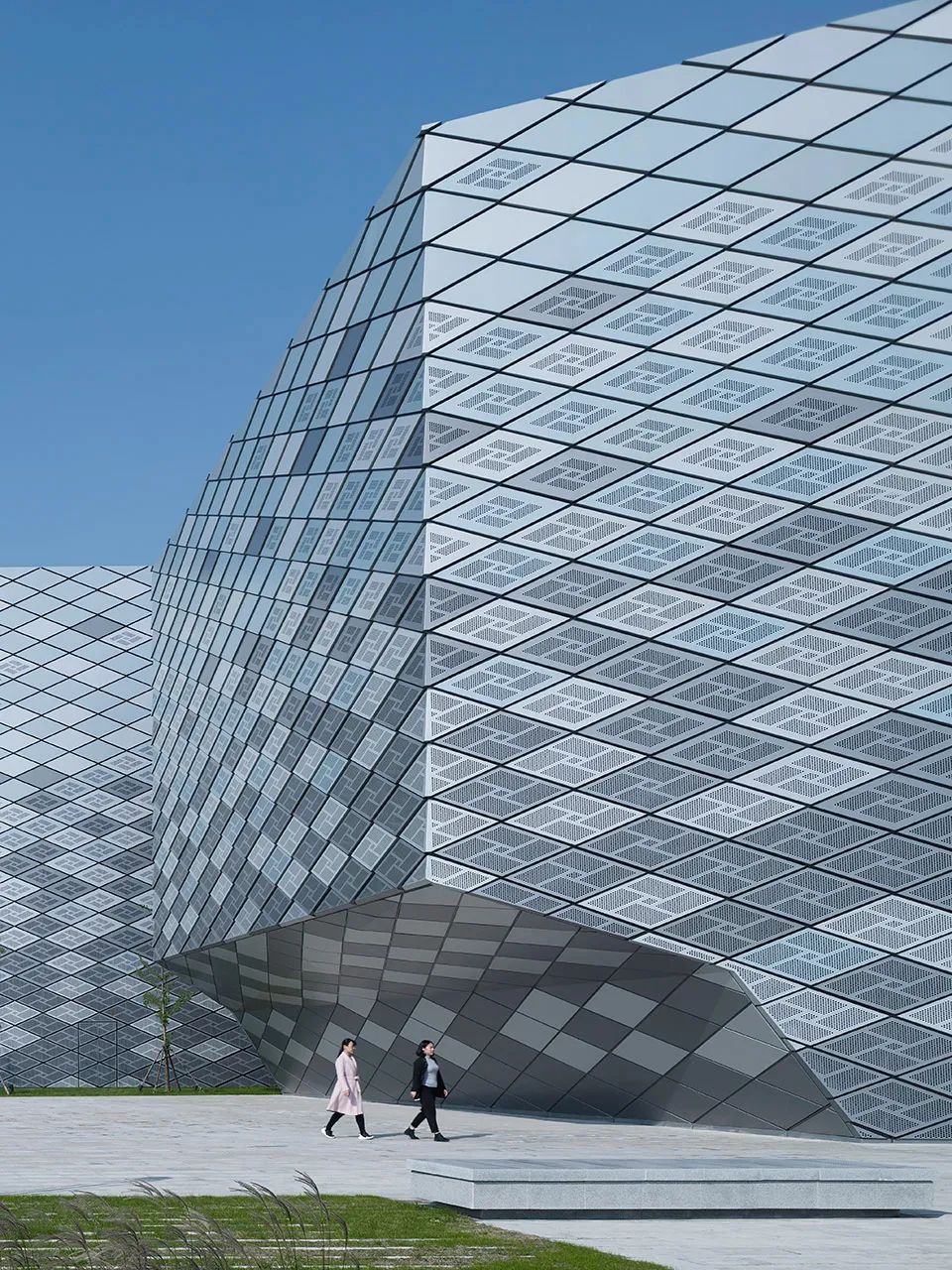 由gmp·馮·格康,瑪格及合伙人建筑師事務(wù)所設(shè)計,整個建筑群外立面、屋面覆蓋菱形鱗片狀鋁板,僅有位于南北側(cè)入口以及建筑體之間接縫處為玻璃幕墻。