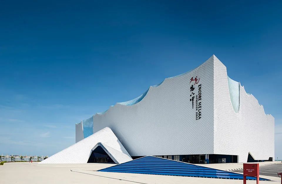 又見馬六甲演藝劇場在馬六甲城的海岸邊,歷經(jīng)5年的創(chuàng)作設(shè)計和施工建造,占地4.75公頃,可容納逾2000人,是馬來西亞首個360度旋轉(zhuǎn)觀眾席的劇場。