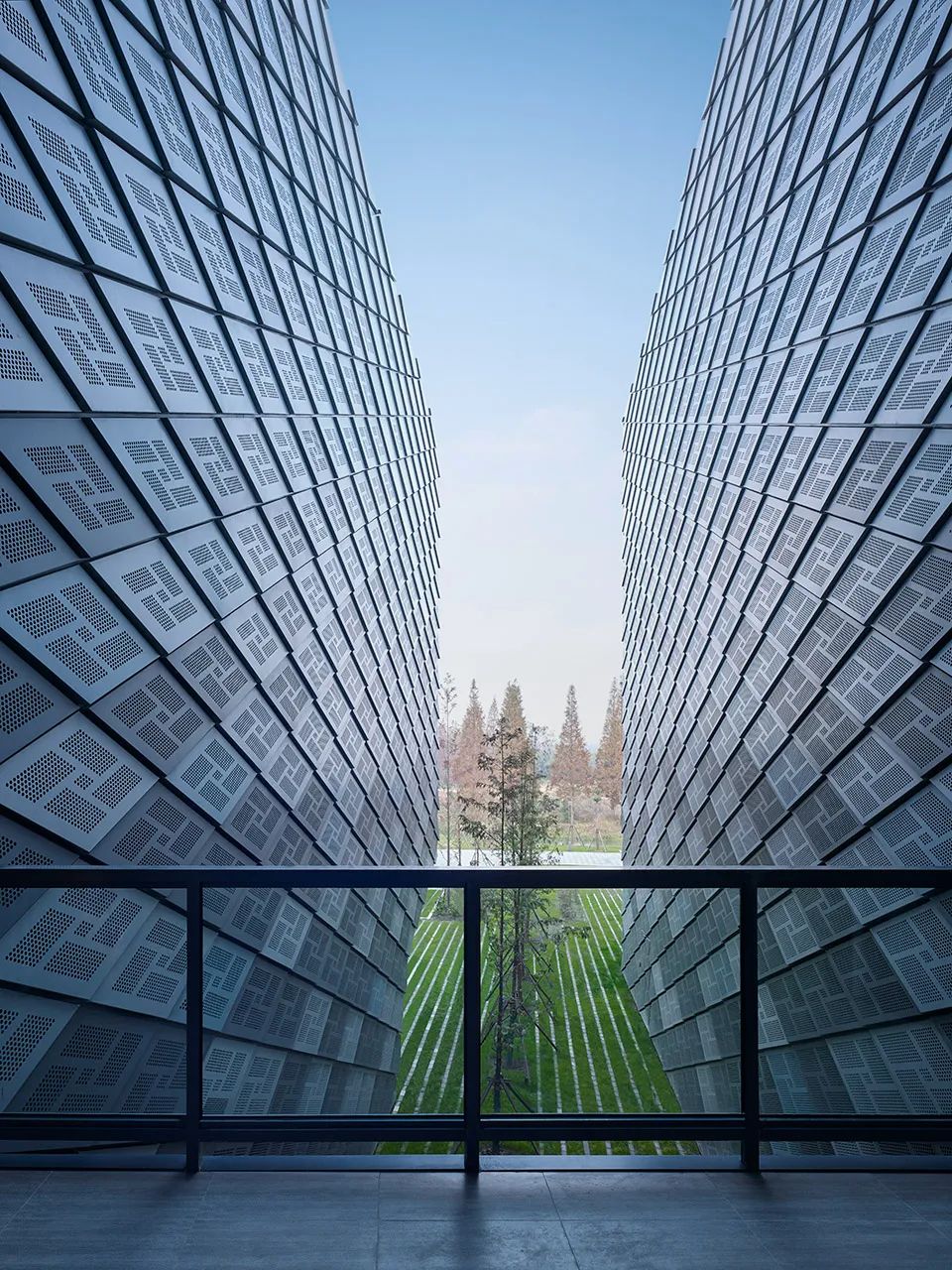 菱形幕墻穿孔鋁板尺寸隨立面變化,最大對角線可達(dá)2米。通過參數(shù)化計算實現(xiàn)了對復(fù)雜幾何外立面的完整覆蓋,模塊化和預(yù)制結(jié)構(gòu)保證了建造方式和成本的經(jīng)濟(jì)集約。