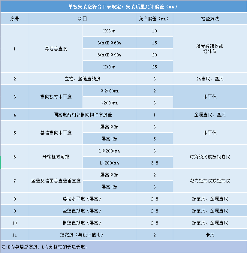 ② 鋁單板安裝前應(yīng)用細(xì)鋼絲拉好控制線,保證安裝精度,單板安裝應(yīng)符合下表規(guī)定: