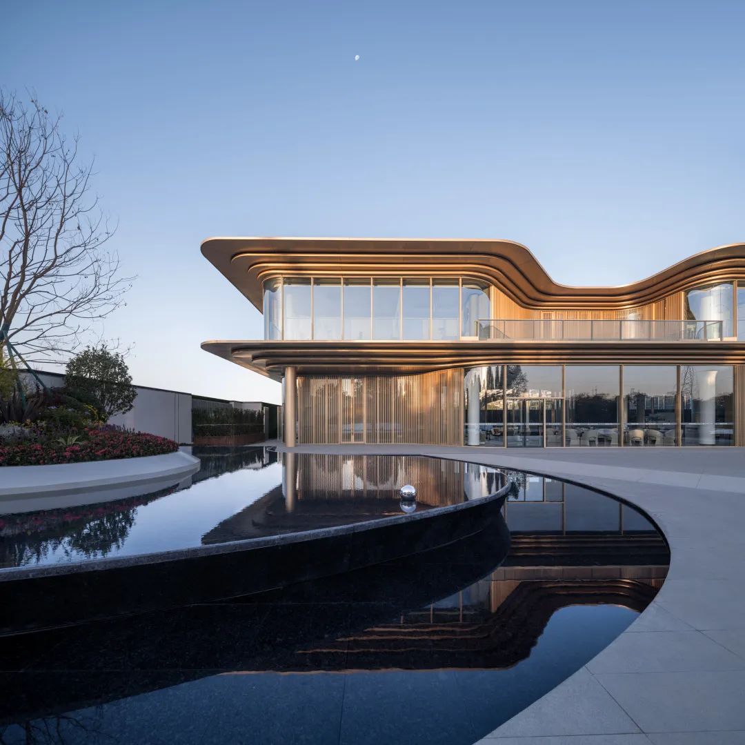 比如杭源里的“超流體”藝術(shù)生活館,圓角曲線的外邊緣就采用超薄的蜂窩鋁板包裹石材肌理的亞克力板,暗藏有LED燈,夜晚透光,大面積超白玻璃幕墻與水環(huán)境疊加,強(qiáng)化超流體建筑的反重力感。
