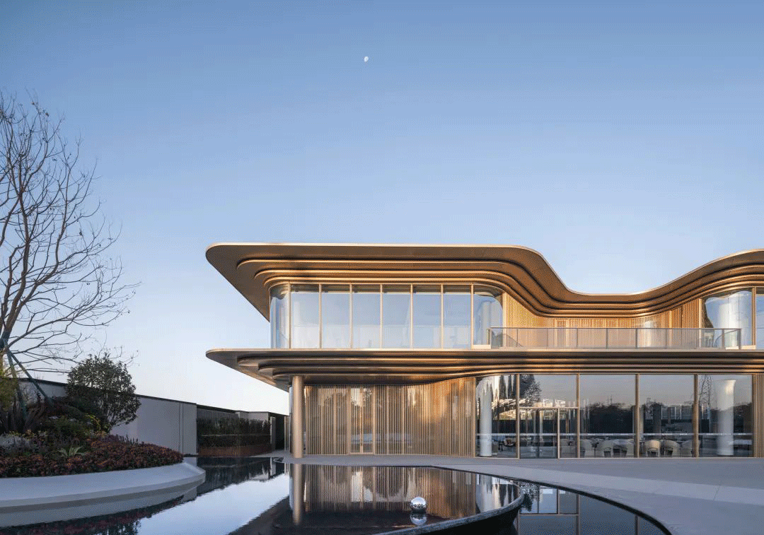 二層主體空間以大面積超白玻璃和香檳金、香檳銀鋁板為主,打造一艘具有動(dòng)感的“舟”。自上而下看,香檳金色格柵天花板豐富視覺效果,香檳銀鋁板與燈帶勾勒出波浪般起伏的屋面。