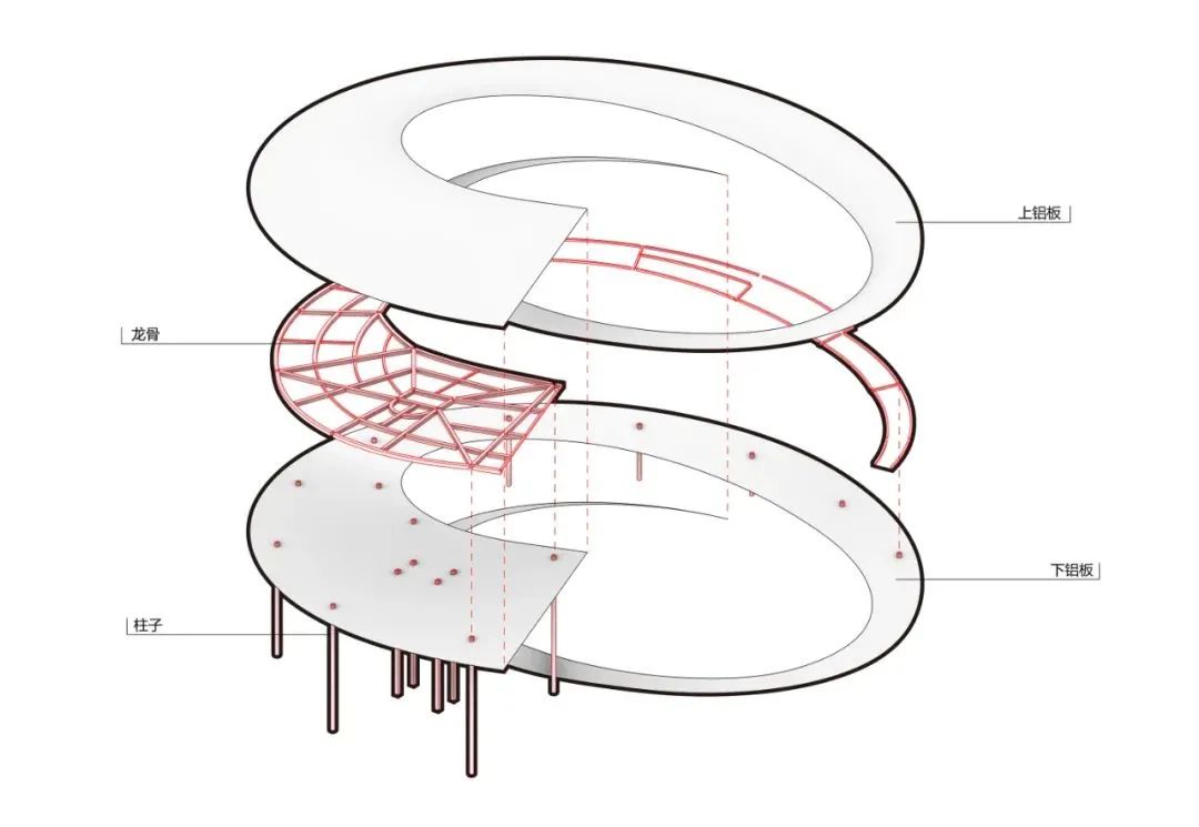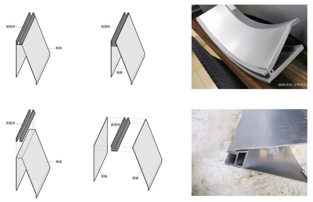 其后,經(jīng)過(guò)多輪構(gòu)造方式比選后,采用后段線條鋁板彎折銜接前段彎弧線條的整體開模方式,將兩段彎弧段線條焊接打磨,最終呈現(xiàn)平滑連續(xù)的線條效果。在施工精度控制上,前段彎弧采用工業(yè)精加工方式委托汽車生產(chǎn)廠家定制。