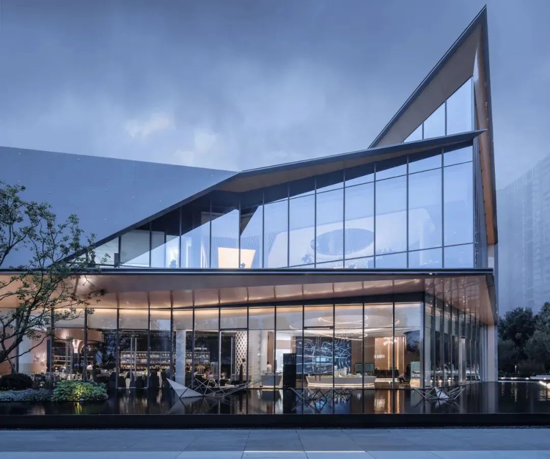 再比如淮安中海九樾示范區(qū),外立面冷色的金屬與玻璃同暖色的木紋轉(zhuǎn)印鋁板形成戲劇化色溫對(duì)比,大堂通透的超白全玻璃幕墻和頂部輕盈的一體化吊頂模糊室內(nèi)外界限。