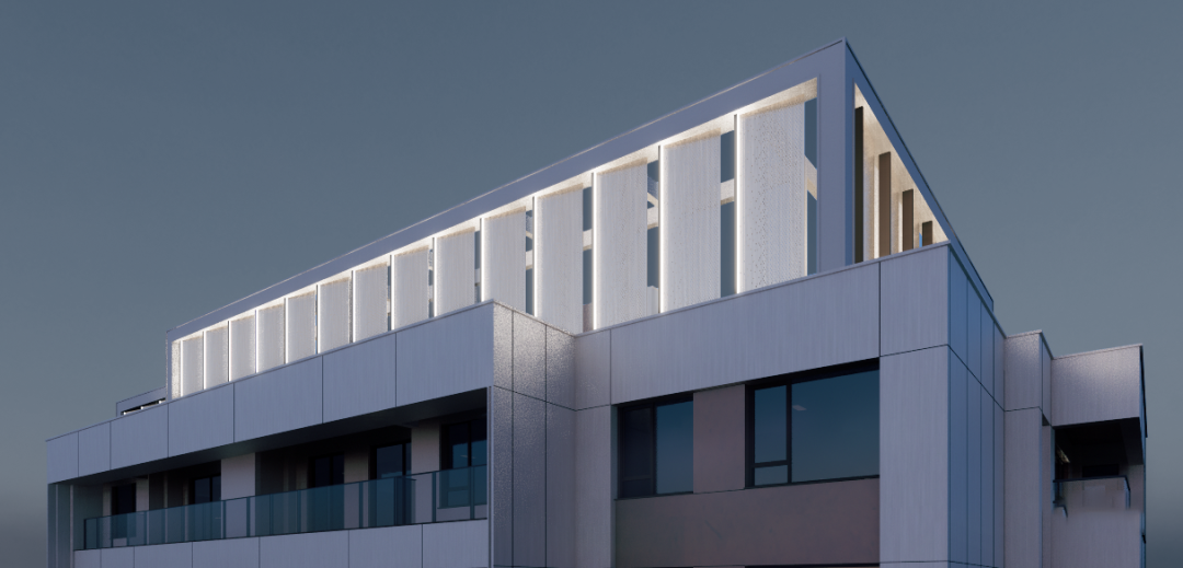 其次優(yōu)化建筑第五立面,增加頂部穿孔鋁板增強(qiáng)建筑挺拔感;最后在人視角度上,使用大面淺色金屬鋁板+深色金屬壓邊的形式,減少人視角度建筑帶來的厚重感,同時(shí)豐富山墻面等可視面的細(xì)節(jié)。