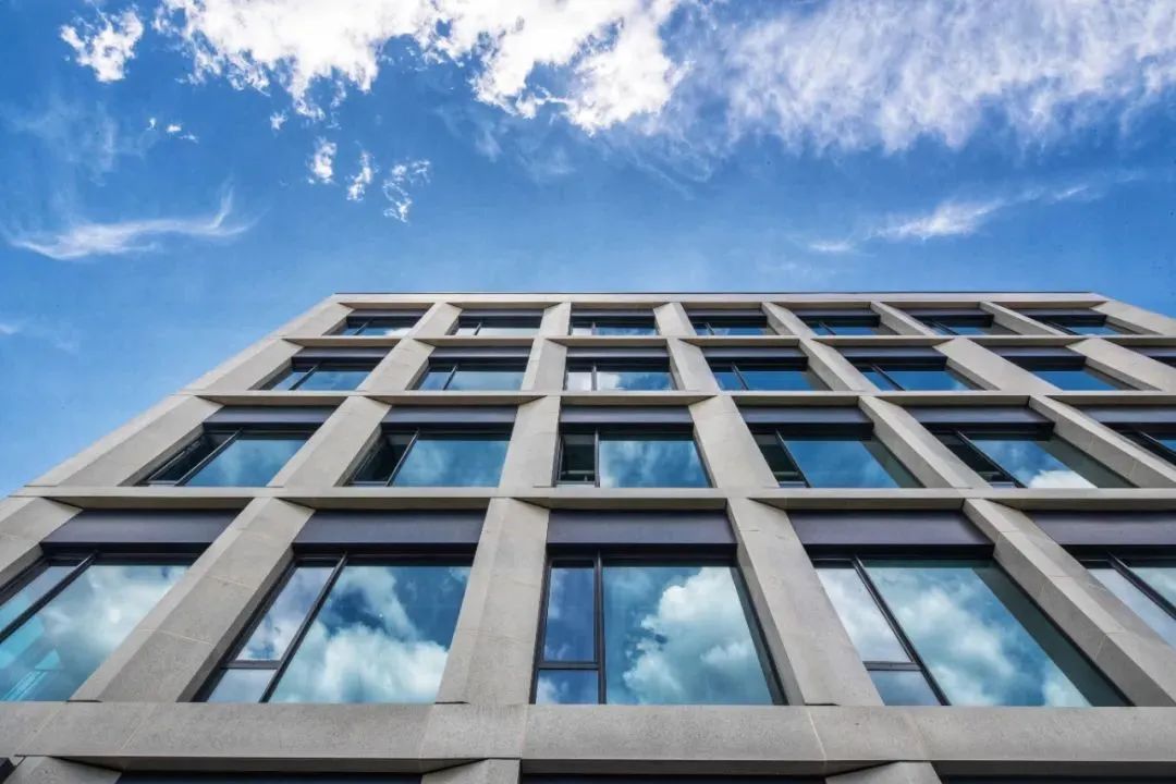 北京金融街·金悅中心7棟商業(yè)辦公樓建筑立面以米黃色仿石鋁板結(jié)合玻璃幕墻的設(shè)計手法,強調(diào)不同體塊轉(zhuǎn)換之間的虛實對比,加強折線所帶來的建筑張力,利用深灰色金屬百葉、灰色鋁板與楔形石材窗框豐富立面變化。