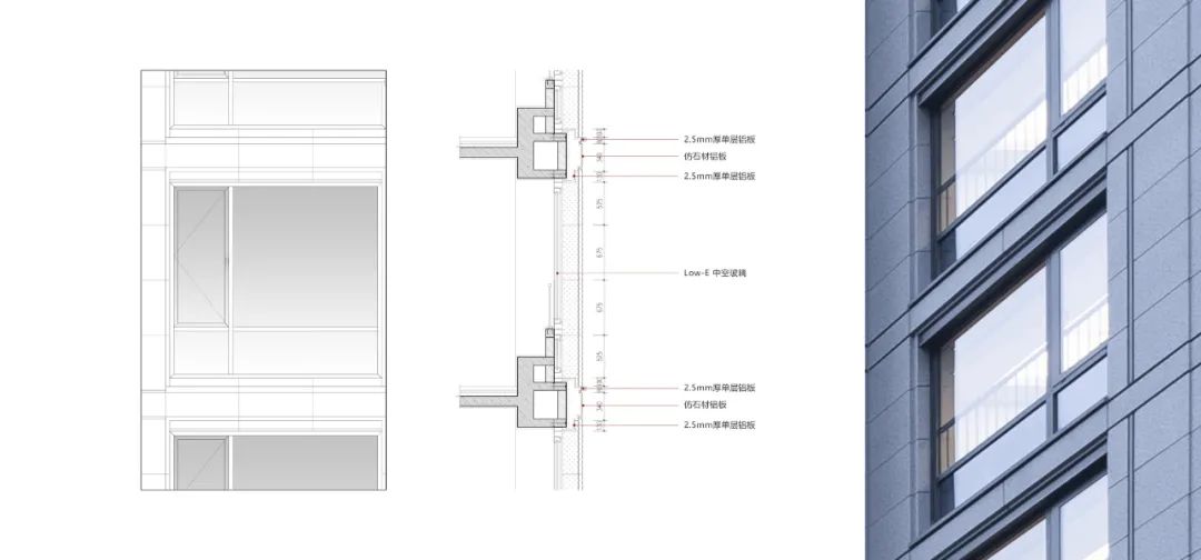 通過滾涂印刷和多次打樣,金麟府選用了效果俱佳、可以假亂真的仿石鋁單板,石材質(zhì)感增添了建筑的細節(jié)表達和價值感,同時也保證了建筑的整體性。