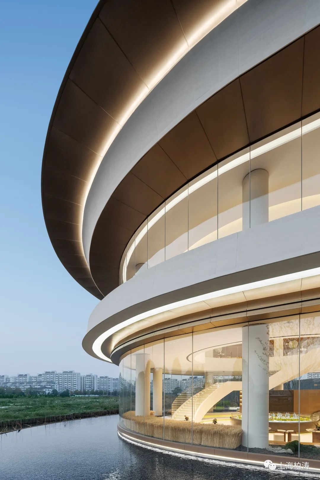 紹興祥生雅居樂 · 鑒湖明樾展示館,外墻選用米白色泥客石結(jié)合香檳色鋁板實現(xiàn)二維曲面造型設(shè)計,室內(nèi)外一體化設(shè)計,沿湖展開面嵌入無框無肋無邊的超白高透玻璃,體現(xiàn)“輕透”而富有雕塑感的“漂浮的盒子”形象。