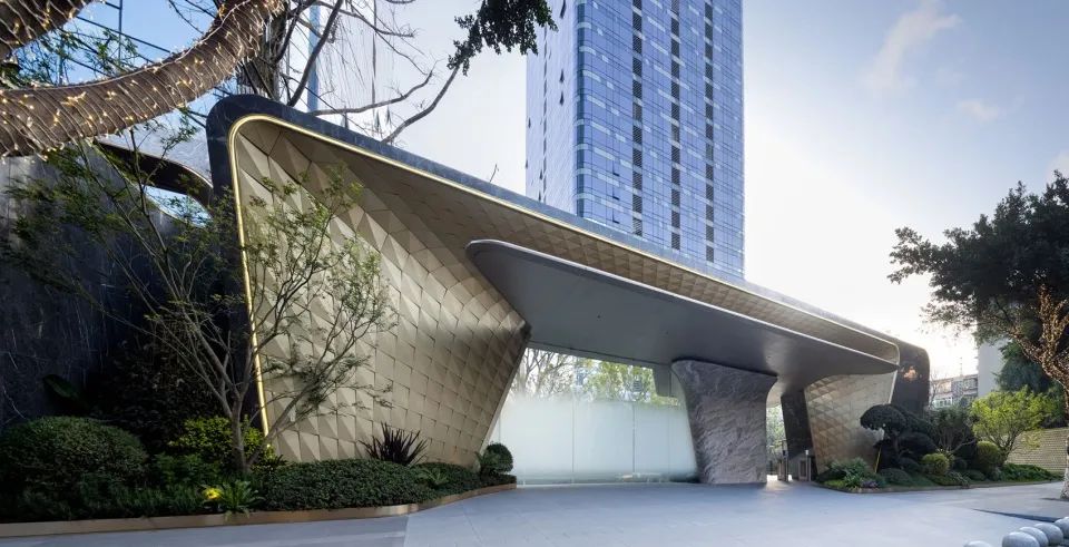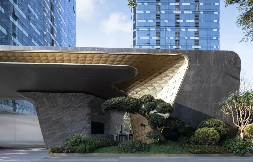 成都宸嘉 · 嘉佰道項(xiàng)目入口構(gòu)筑采用全界面3D曲面鋁板,金灰的雅致配色,形成與建筑的遙相呼應(yīng)。