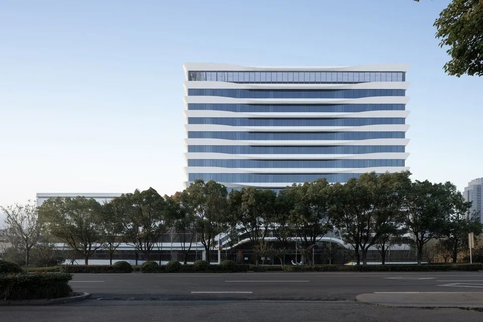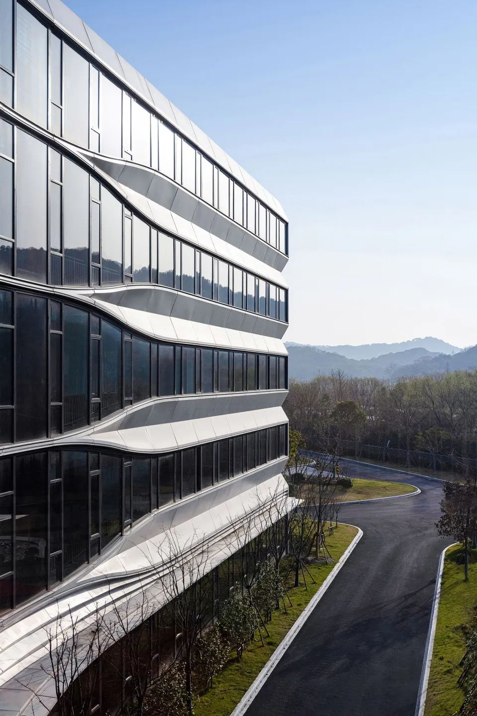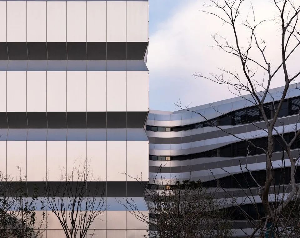 杭州HIS國(guó)際學(xué)校主教學(xué)樓的建筑立面通過(guò)對(duì)水平線的強(qiáng)調(diào),采用銀白色鋁板和水晶灰玻璃,通過(guò)水平方向上的內(nèi)凹折面,形成了極富未來(lái)感的現(xiàn)代建筑形象。