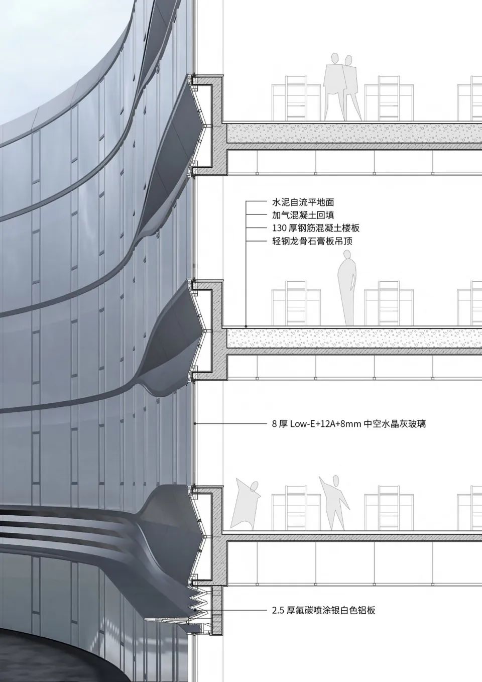 1、鋁板的常見(jiàn)種類(lèi): 穿孔鋁板、蜂窩鋁板、陽(yáng)極氧化鋁板、石材轉(zhuǎn)印鋁板、木紋轉(zhuǎn)印鋁板、水波紋鋁板、雙曲鋁板、仿銅鋁板、拉絲鋁板、鋁單板 ... 2、材料特性: 優(yōu)點(diǎn): ① 綠色環(huán)保,可百分百回收再利用; ② 防火防水,鋁材本身就不會(huì)生銹,所以自然避免了這一現(xiàn)象; ③ 剛性好,重量輕,強(qiáng)度高; ④ 防蟲(chóng)駐易清理,因?yàn)槿X鋁板的鋁材不會(huì)產(chǎn)生蟲(chóng)蛀的現(xiàn)象,而且表面是高工藝壓縮,所以耐擦拭易清洗。 ⑤ 不易玷污,便于清潔保養(yǎng); ⑥ 安裝施工方便快捷,在工廠成型,施工現(xiàn)場(chǎng)不需裁切,只需簡(jiǎn)單固定; 缺點(diǎn): ① 鋁板幕墻系統(tǒng)的抗變形能力須對(duì)幕墻系統(tǒng)的每個(gè)重要部位進(jìn)行科學(xué)的力學(xué)計(jì)算,考慮風(fēng)壓、自重、地震、溫度等作用對(duì)幕墻系統(tǒng)的影響,對(duì)埋件、連接系統(tǒng)、龍骨系統(tǒng)、面板及緊固件進(jìn)行仔細(xì)校核,確保幕墻的安全性; ② 鋁板價(jià)格相對(duì)昂貴; 3、應(yīng)用案例(因篇幅原因,簡(jiǎn)單舉例2-3個(gè)項(xiàng)目) 能建城發(fā)·中寧府的外立面采用大面積玻璃+金屬鋁板,在色彩搭配上,以香檳金和典雅灰的奢雅色彩美學(xué)為基礎(chǔ),局部多色澤處理增加立面趣味,其在陽(yáng)光不同方位的照射下,輝映出不同的光澤。 外立面實(shí)景圖 在主線條轉(zhuǎn)折和形體轉(zhuǎn)角區(qū)以圓弧加工手法,更運(yùn)用了轉(zhuǎn)角、切割、圓弧等復(fù)雜的程序,呈現(xiàn)建筑的柔和立面特質(zhì)。 主教學(xué)樓墻身外觀 ? 蘇圣亮 主教學(xué)樓墻身大樣 ? line+ 建筑外觀? 蘇圣亮 入口細(xì)部 ? xf photograph 入口細(xì)部 ? xf photograph 實(shí)景圖 ?耿廣瀚 塔樓整體造型簡(jiǎn)潔而優(yōu)雅,主體采用6mm50+15A+6mm淺灰色雙層low-e中空玻璃玻璃幕墻加外掛銀白色鋁板水平橫線條的處理方式,簡(jiǎn)潔大氣;同時(shí),通過(guò)不同樓層間水平線條90度的細(xì)微扭轉(zhuǎn),形成充滿(mǎn)動(dòng)感的肌理,在陽(yáng)光下也產(chǎn)生出微妙的光影變化。 實(shí)景圖 ?耿廣瀚 實(shí)景圖 ?耿廣瀚 為了實(shí)現(xiàn)水平橫線條的旋轉(zhuǎn)造型,將曲線的曲率由1200mm調(diào)整為2000mm,簡(jiǎn)化了制作和施工工藝,達(dá)到了簡(jiǎn)潔、高效、經(jīng)濟(jì)的實(shí)現(xiàn)了預(yù)期的設(shè)計(jì)效果。 陽(yáng)極氧化鋁板立面, ?文沛