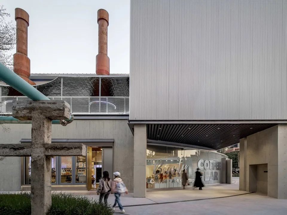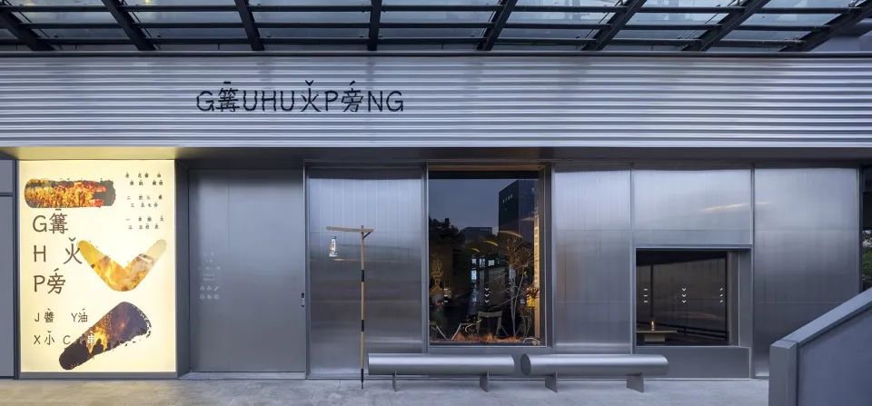 外立面使用的材質(zhì),啞面不銹鋼,波浪鋁板,玻璃,陽光板。方管和啞面不銹鋼搭建骨架,不銹鋼移門,陽光板,透明玻璃,完成整體半透明的外殼,如同帳篷的外賬,在夜里點亮只需要微弱的光亮。