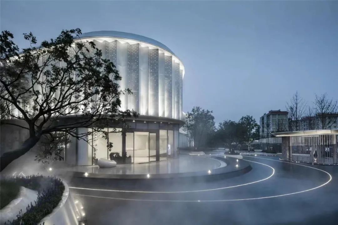 雅居樂&綠地·云和中心示范區(qū)二/三層是懸挑的金屬盒子,采用純白的氟碳噴涂鋁折板,鋁折板通過沖孔板與實板大小變化規(guī)律排列,如同即將啟航的風(fēng)帆。
