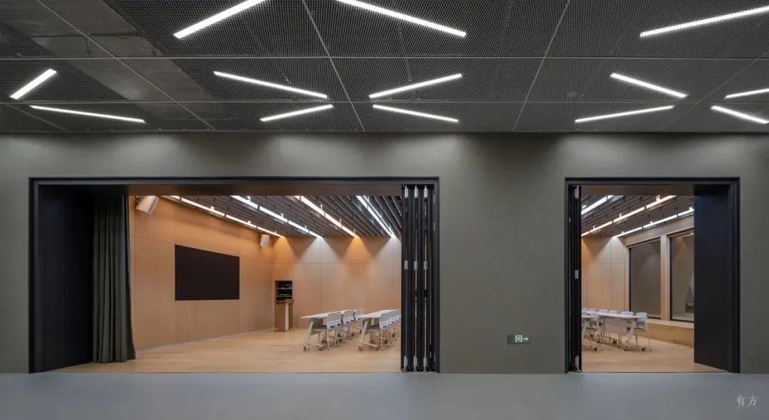 木飾面吊頂作為氛圍營造的手段,并不遮擋建筑本身的結(jié)構(gòu)骨架,而是作為建筑結(jié)構(gòu)間面的填充存在,而歸整機(jī)電設(shè)備的金屬網(wǎng)板,也以其材質(zhì)的特性,一方面將機(jī)電設(shè)備