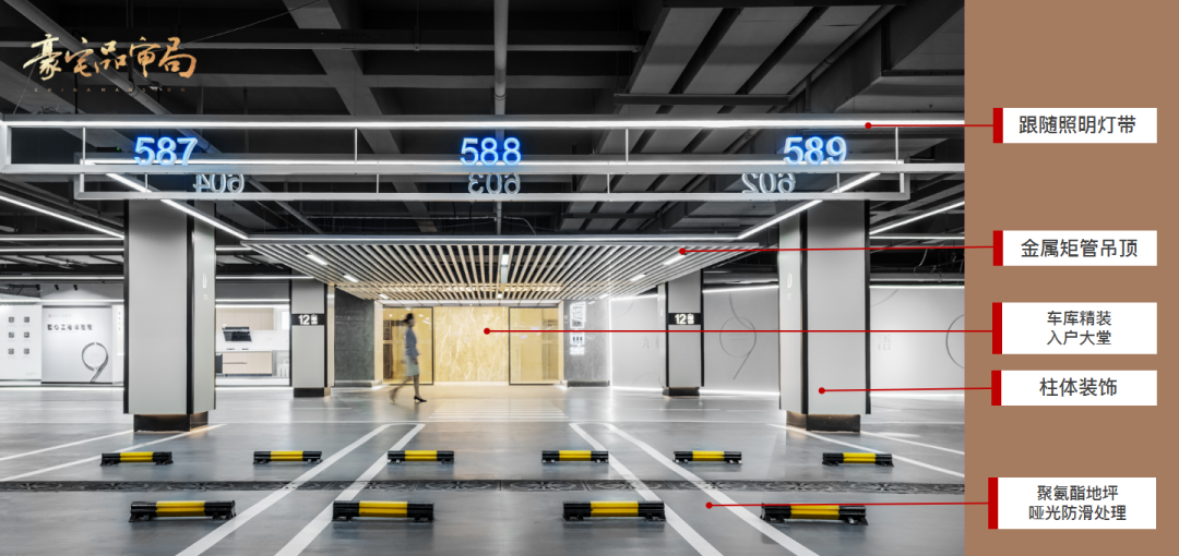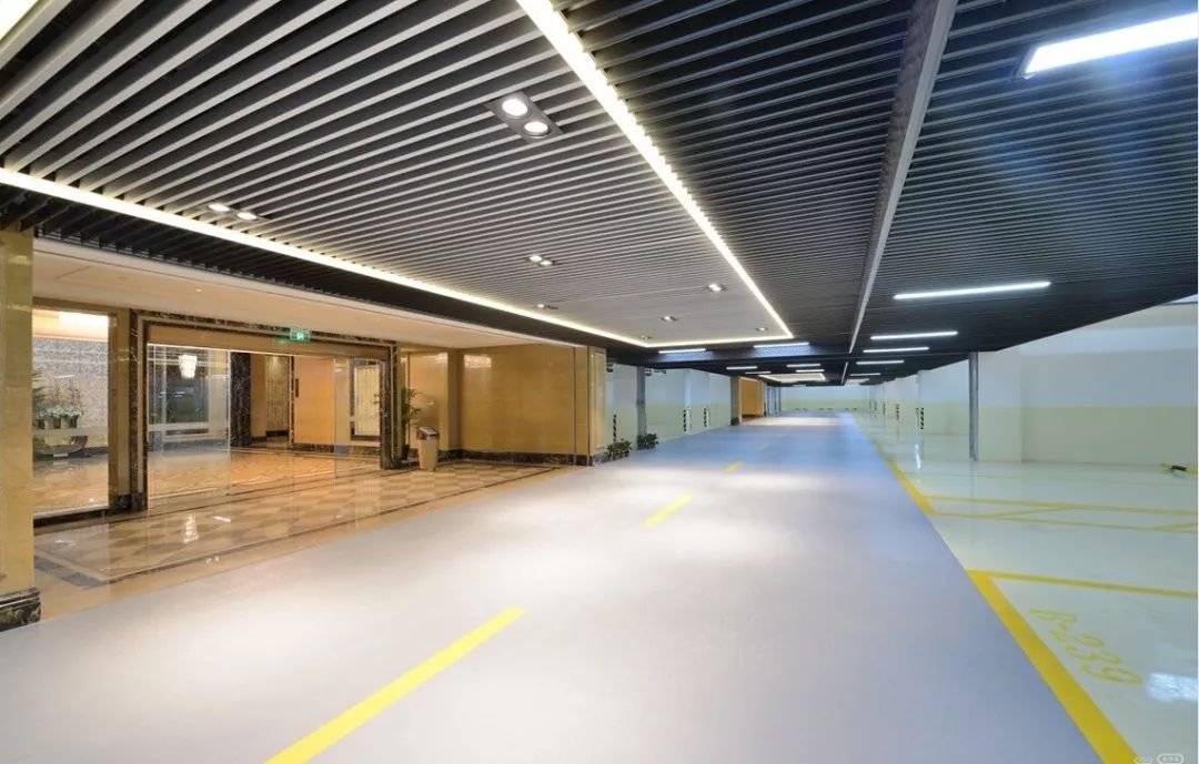 綠城的項目地下車庫層高為3600mm時,主要車行道與地下門廳前采用柵吊頂裝飾。綠城項目的吊頂材料為深咖色金屬橫條格柵,燈具隱藏安裝格柵間,以暖黃色的筒燈