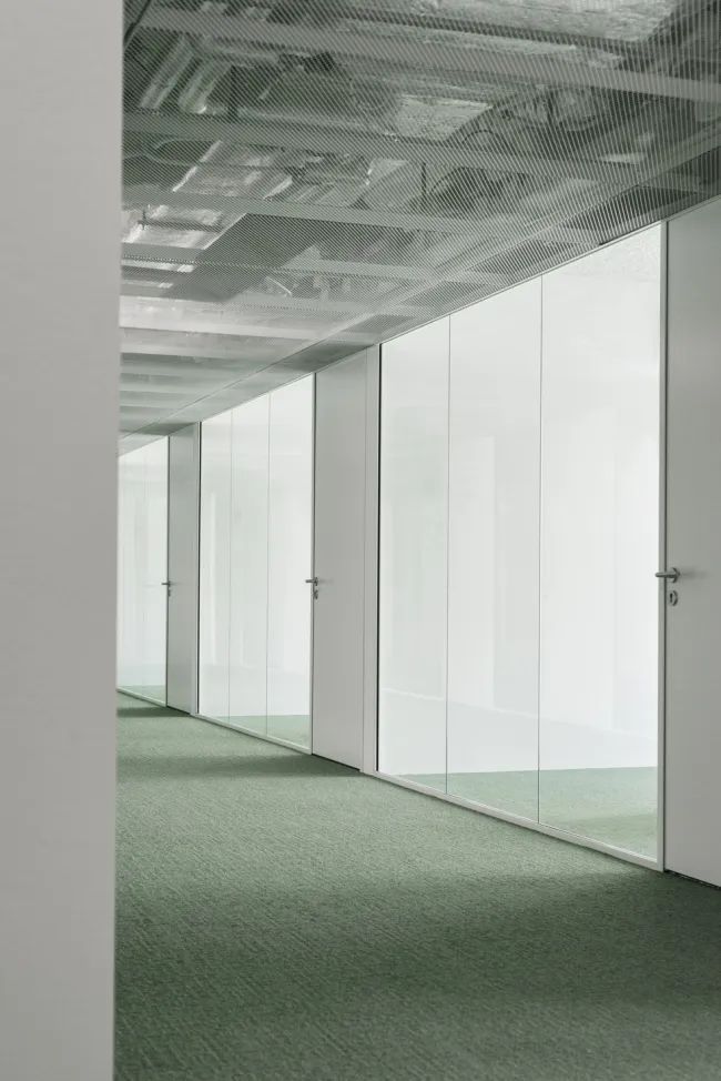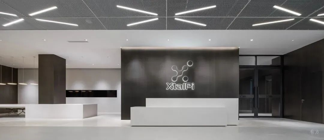 晶泰科技全球研發(fā)總部利用金屬板、人造石、U型玻璃等材料構(gòu)建空間,入口大廳的金屬拉伸網(wǎng)天花吊頂,從入口一直延伸到辦公區(qū),吊頂內(nèi)安裝了線型照明,使公司標(biāo)志的