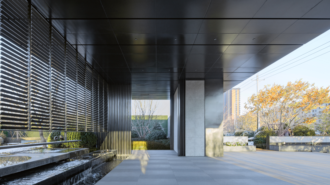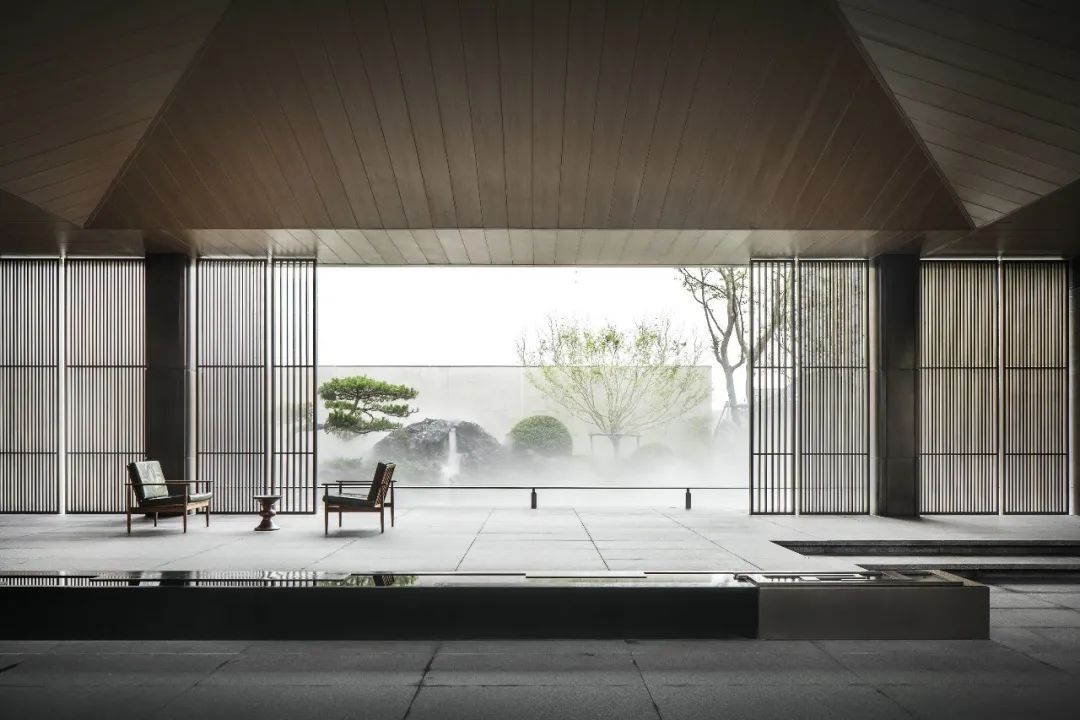 凱撒灰石材墻面和深色金屬瓦屋面筑定了整體沉著大氣的基調(diào),進(jìn)一步用木紋金屬吊頂、金屬格柵和欄桿勾勒工藝細(xì)節(jié)。造園疊山則選用了黑山石,與整體氛圍更為融合。