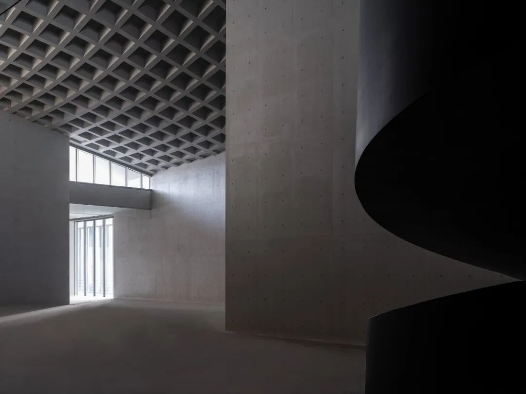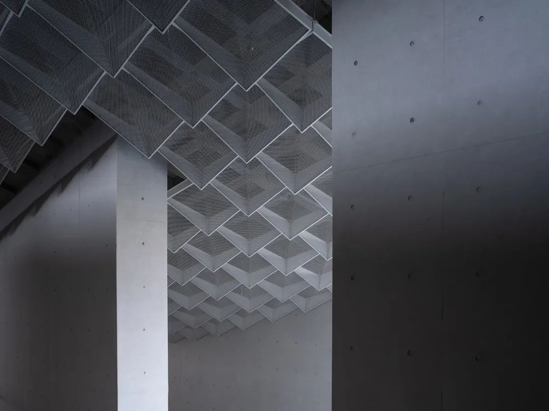 琴臺美術(shù)館柱室內(nèi)屋頂采用了與井格對應(yīng)的、順應(yīng)了曲面的參數(shù)化金屬延展網(wǎng)吊頂。透過半透明的吊頂還是能看到屋頂?shù)慕Y(jié)構(gòu),也遮蔽著其中的機(jī)電管線。