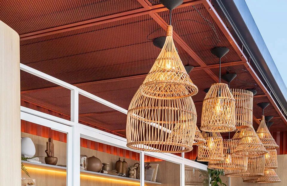 作為裝飾的吊頂在這個市集中主要包括兩部分,一部分是作為氛圍營造和空間界定的木飾面吊頂,另一部分是為了歸整機(jī)電設(shè)備的金屬網(wǎng)板吊頂。