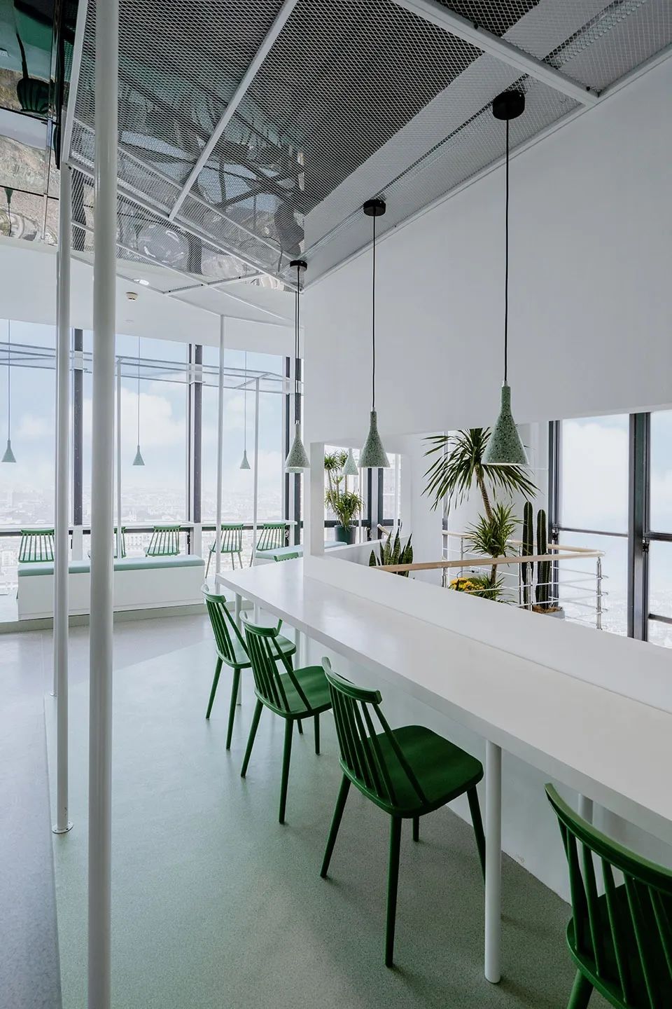 蘇州“云廊”空中自習(xí)室,空間內(nèi)部利用輕質(zhì)網(wǎng)狀金屬吊頂與連續(xù)秩序的鋼架重塑游廊的意境,使大空間分割為不同尺度與功能的區(qū)域,但視線的阻礙并沒有割裂空間的連續(xù)性,