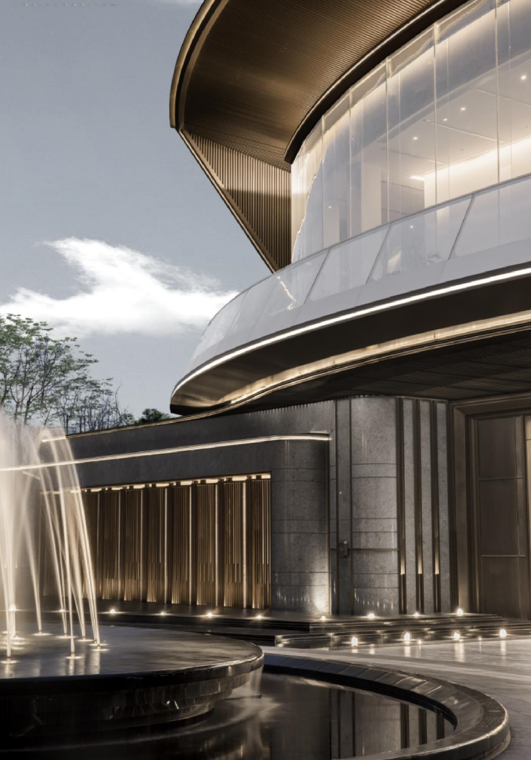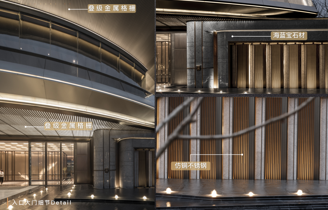 龍湖天府·云河頌示范區(qū)入口主打“奢華酒店化”,實壁柱金屬印、吊頂金屬格柵、電動門手敲銅及石材鑲嵌等一系列工藝工法,讓整個入口空間精致耐看。