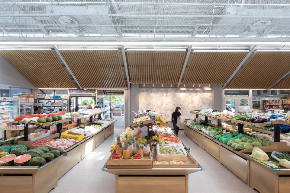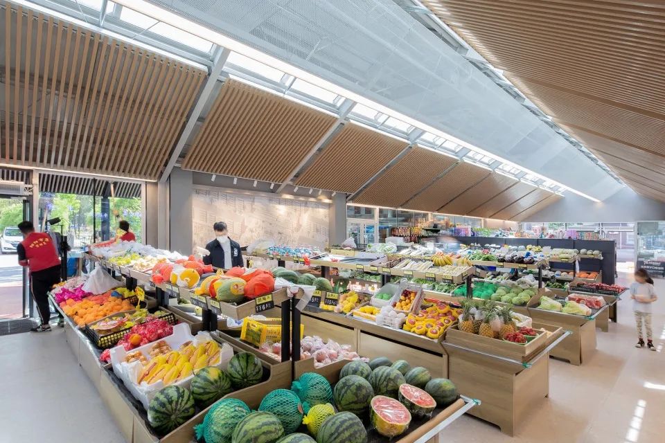 北京興華東里鄰里市集的大屋頂下,溫暖的木質(zhì)吊頂營造出一片溫暖的氛圍,為居民提供了具有停留感的場所。