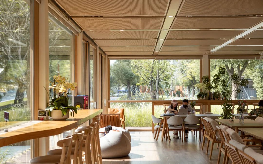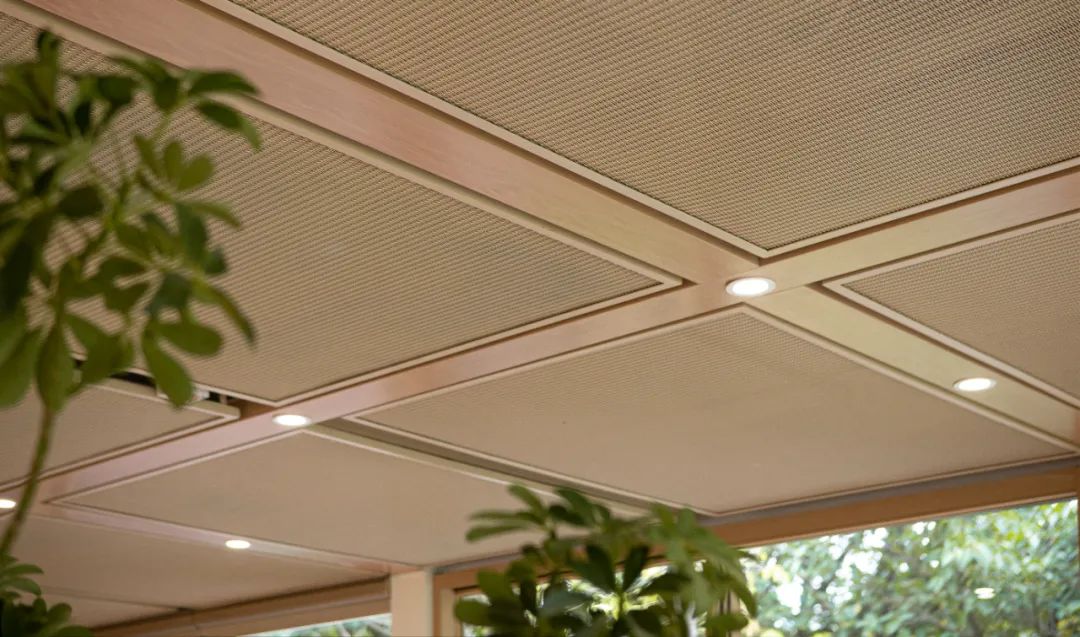 深圳大沙河公園濱水茶室在吊頂?shù)奶幚砩?,為了更好地營造出茶空間的氛圍,設(shè)計運用了木橫梁搭配金屬網(wǎng)簾的交織排布,巧妙隱藏機(jī)電管道的同時,也讓通透的空間多