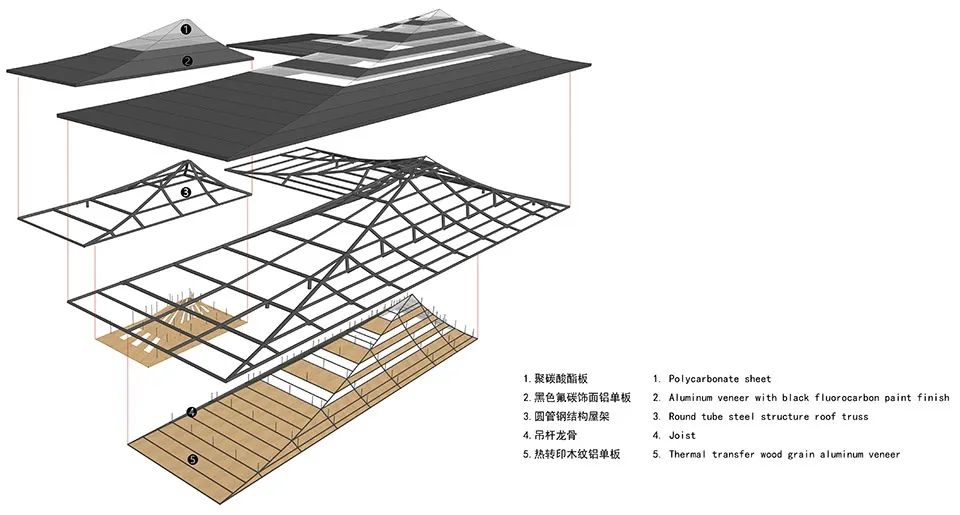 崇州·竹藝村游客中心為了強(qiáng)化建筑的竹編文化屬性,竹筍大屋頂?shù)膬?nèi)部結(jié)構(gòu)按照傳統(tǒng)竹編骨架的方式設(shè)計,接待大廳的室內(nèi)吊頂采用長條狀的木色鋁板和半透明聚碳酸酯板編織而成,