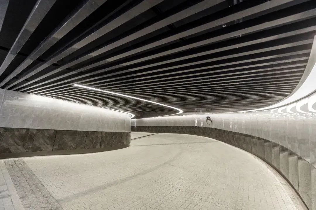 成都人居·九林語項目地下車庫坡道,頂部由金屬矩管吊頂、三條LED照明燈帶鑲嵌其中,質(zhì)感十足。