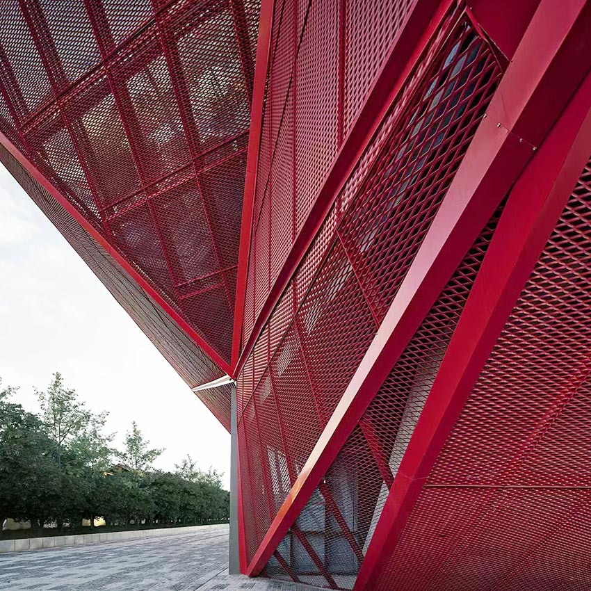 金屬拉網(wǎng)鋁單板又稱拉伸網(wǎng)、沖剪網(wǎng),主要由網(wǎng)板和邊框構(gòu)成,網(wǎng)板格子的大小和形狀均可按需定制,邊框構(gòu)造主要為方便鋁板安裝而設(shè)計(jì),一般為勾搭式邊框或四方框配上角碼。金屬網(wǎng)格是通過特殊制造工藝在鋁板表面同時(shí)進(jìn)行切割和拉伸,制作出需要的網(wǎng)孔,通過網(wǎng)孔的形狀、方向以及照明和顏色變化,使建筑裝飾設(shè)計(jì)更加富有個(gè)性化和時(shí)尚氣息。與傳統(tǒng)使用的鐵絲網(wǎng)相比,拉網(wǎng)鋁單板既具有視覺上的通透性,又擁有結(jié)構(gòu)上的強(qiáng)度與剛度,還有出色的抗腐蝕性、抗風(fēng)壓和抗震性等特點(diǎn)。