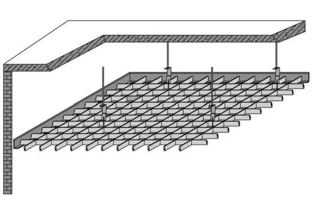 對(duì)于條格布置緊湊,且雙向跨度較大的格柵式吊頂,其整幅吊頂面的中央部分也應(yīng)略有起拱。