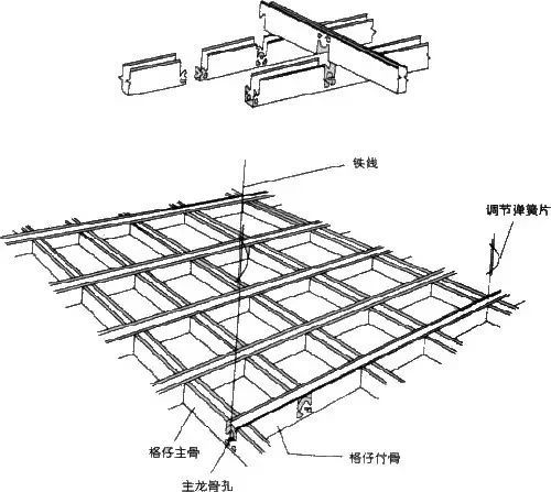 將預(yù)裝好的格柵天花用吊鉤穿在主骨孔內(nèi)吊起,將整柵的天花連接后,調(diào)整至水平即可。