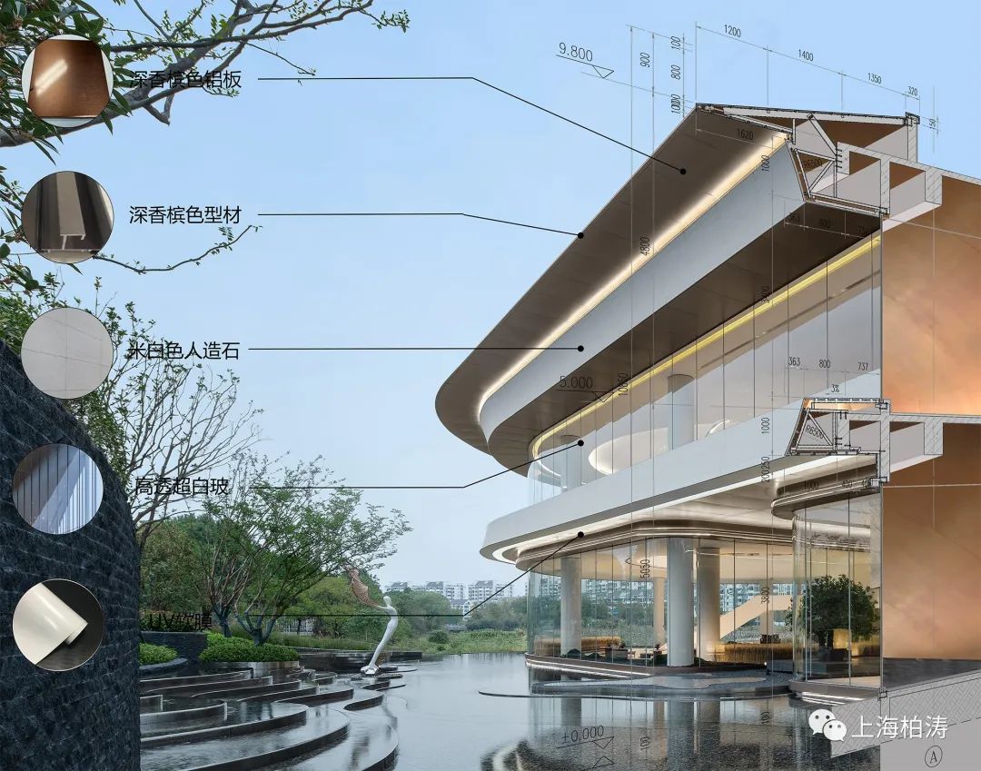 紹興祥生雅居樂 · 鑒湖明樾展示館,外墻選用米白色泥客石結(jié)合香檳色鋁板實現(xiàn)二維曲面造型設(shè)計,室內(nèi)外一體化設(shè)計,沿湖展開面嵌入無框無肋無邊的超白高透玻璃,體現(xiàn)“輕透”而富有雕塑感的“漂浮的盒子”形象。