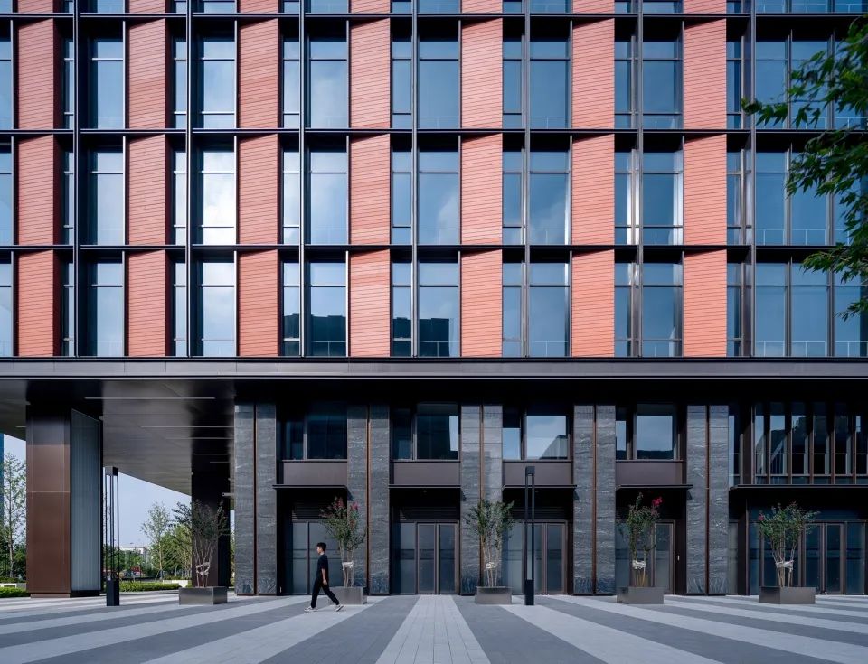 主樓的基座部分采用了黑色的石材和玻璃,從而增加了底部的穩(wěn)重感;中部立面以紅色陶板和玻璃幕墻為主要材質(zhì),呈現(xiàn)出豎向斜面陶板與玻璃幕墻虛實相間的立面效果,并在光影下顯示強烈的韻律感,塑造出對比強烈且極具秩序感的標(biāo)準(zhǔn)段落。