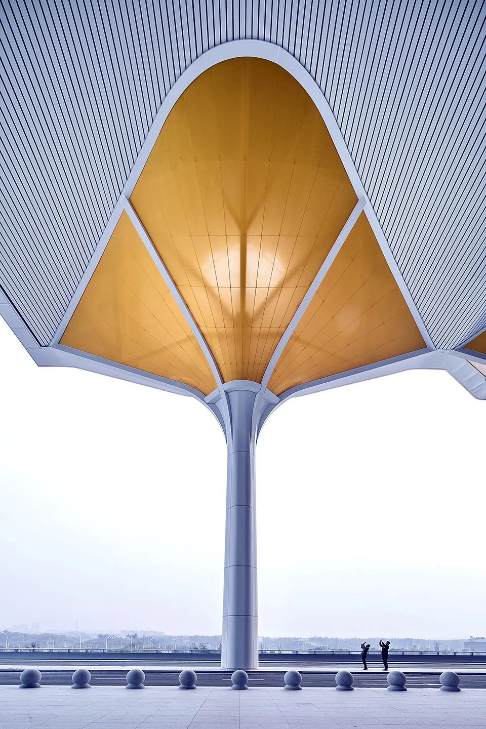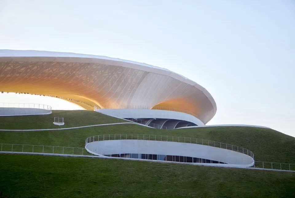 罩棚底面則覆蓋曲面白色穿孔鋁板,天光透過(guò)罩棚漫射于場(chǎng)館,營(yíng)造豐富的光影層次。