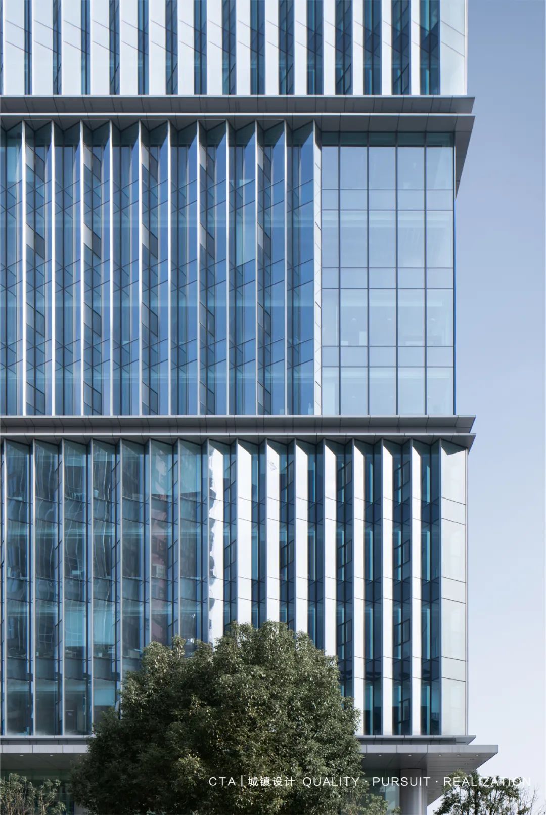 幕墻創(chuàng)造性地采用整層高的玻璃劃分,豎向網(wǎng)格狀的明框玻璃,有效減少西側(cè)太陽的直射影響,顯著降低高層建筑能耗,室內(nèi)視野開闊,純凈通透,營造更高品質(zhì)的室內(nèi)辦公空間。