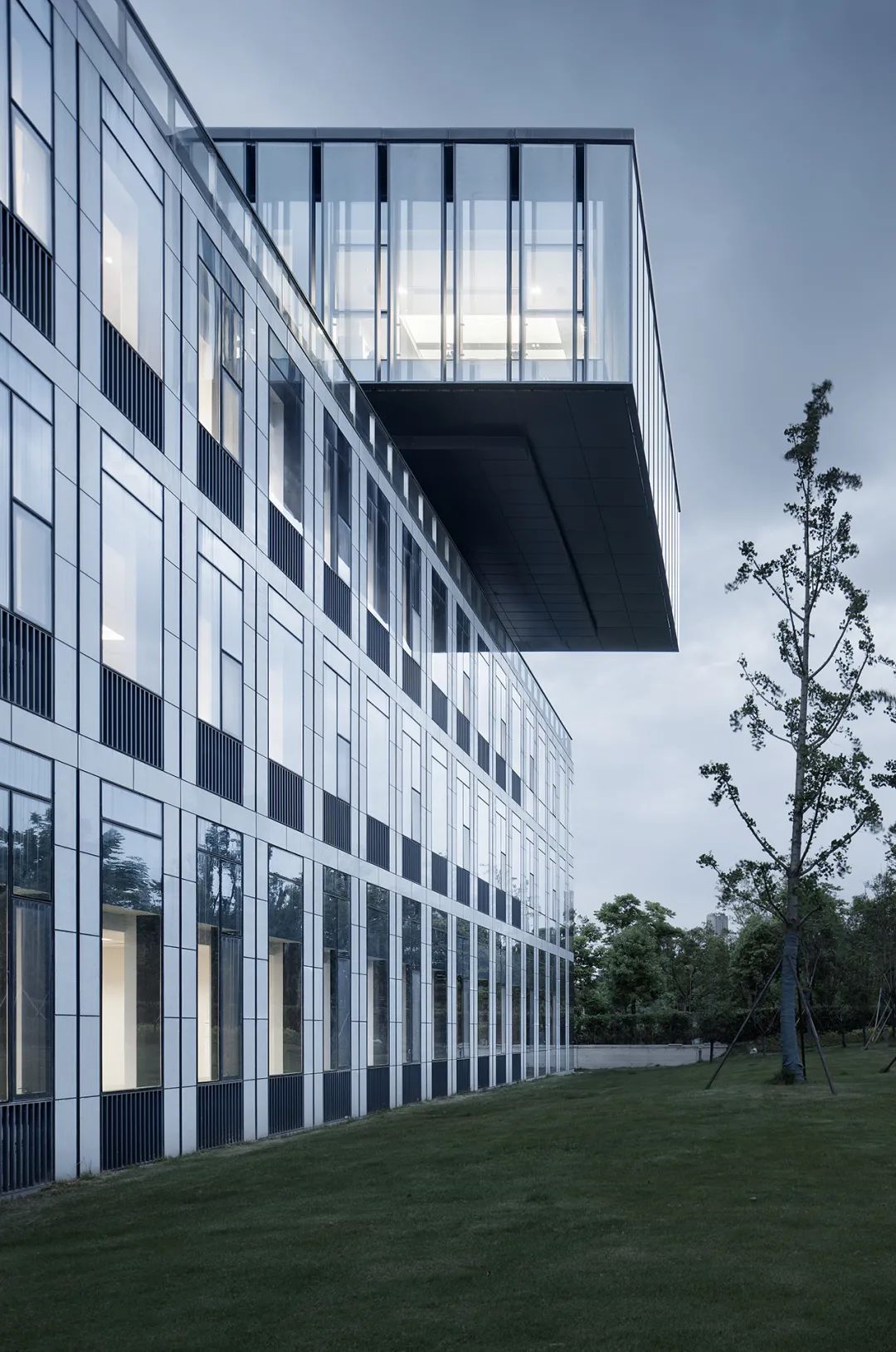 杭州錢江新城市政設施養(yǎng)護維修配套用房在材料的選用上,采用藍灰色玻璃及淺灰色石材干掛,搭配深色金屬板,打造清新明快的風格。立面開窗采用模數(shù)化的處理方式,展現(xiàn)簡潔統(tǒng)一的效果。